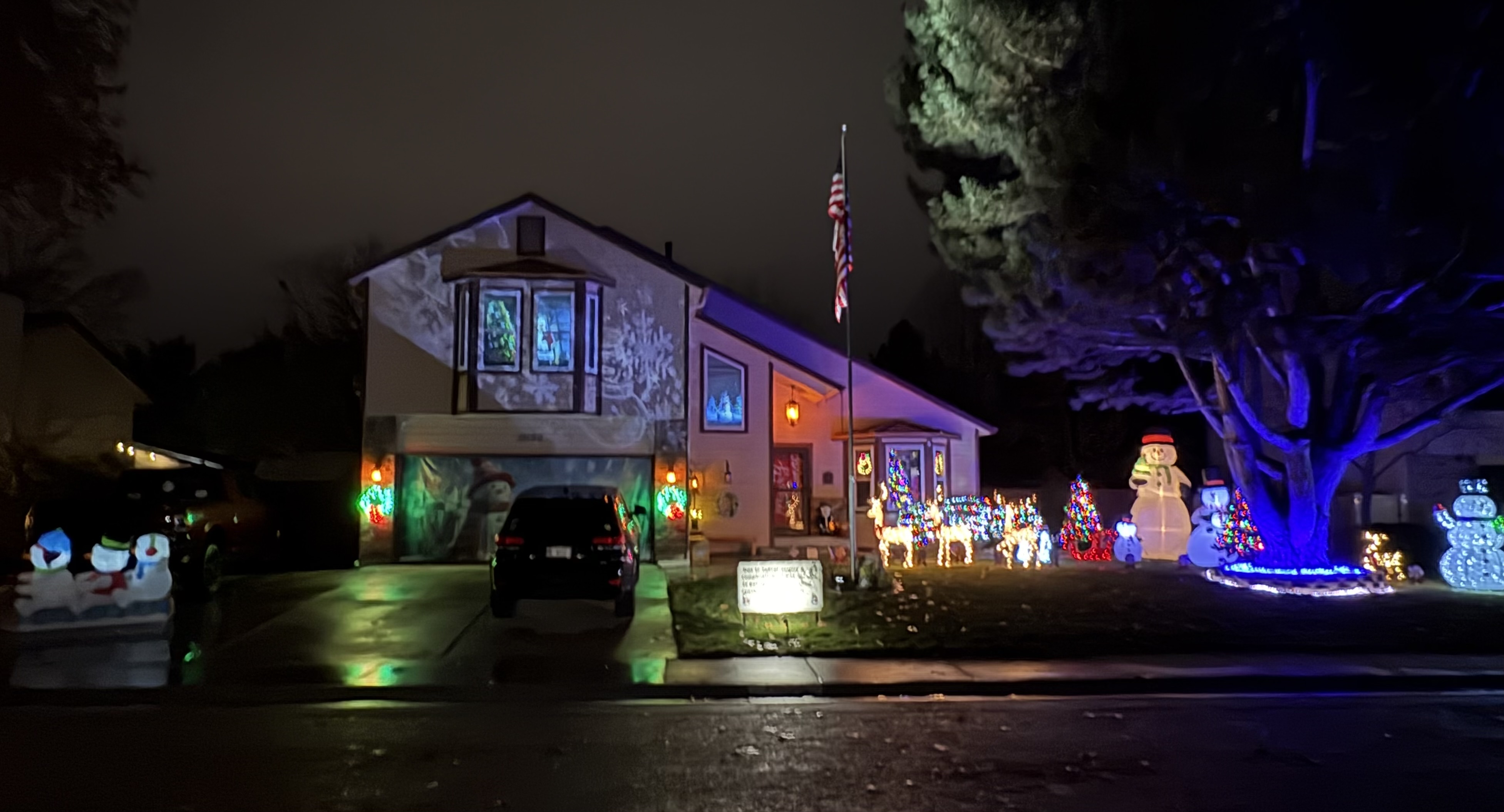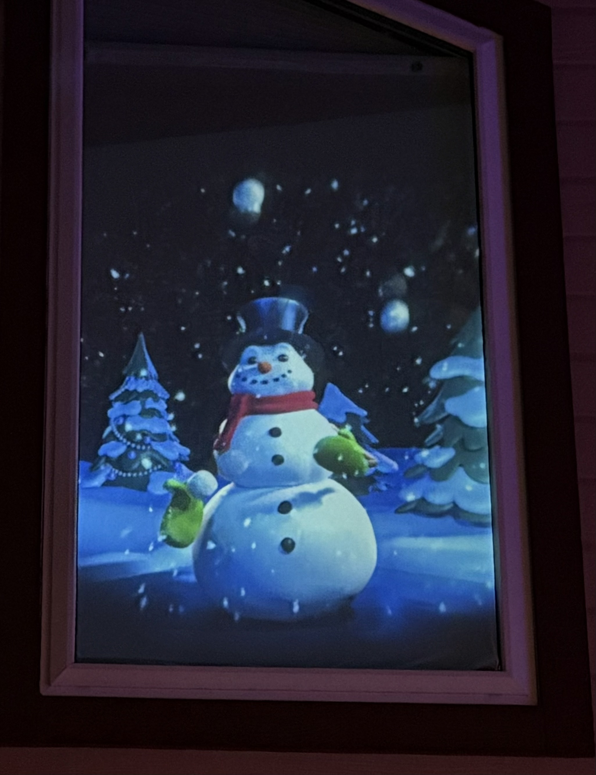 Due to my recent cancer surgery and unforeseen complications, we were unable to put up our lights synchronized to music. We do have a display up with Santa, walking around in the upstairs window and a snowman who will move and entertain in the middle window. If you’re in the area, please come on out.